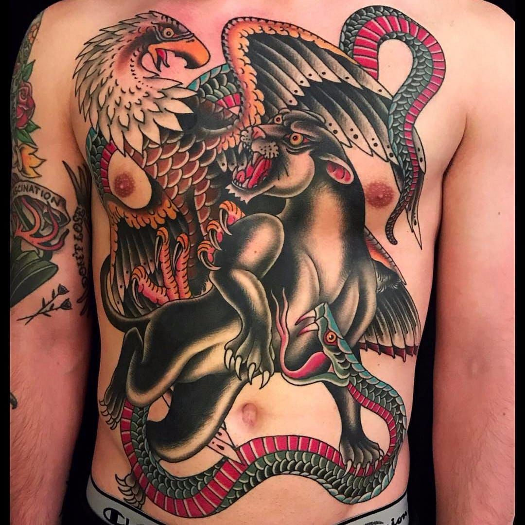 Tattoo Uploaded By Tattoodo A Fighting Triad By Grez Grez Kingsavenuetattoo Kingsavetattoo Eagle Panther Snake Cobra Color Traditional Tattoooftheday Tattoodo